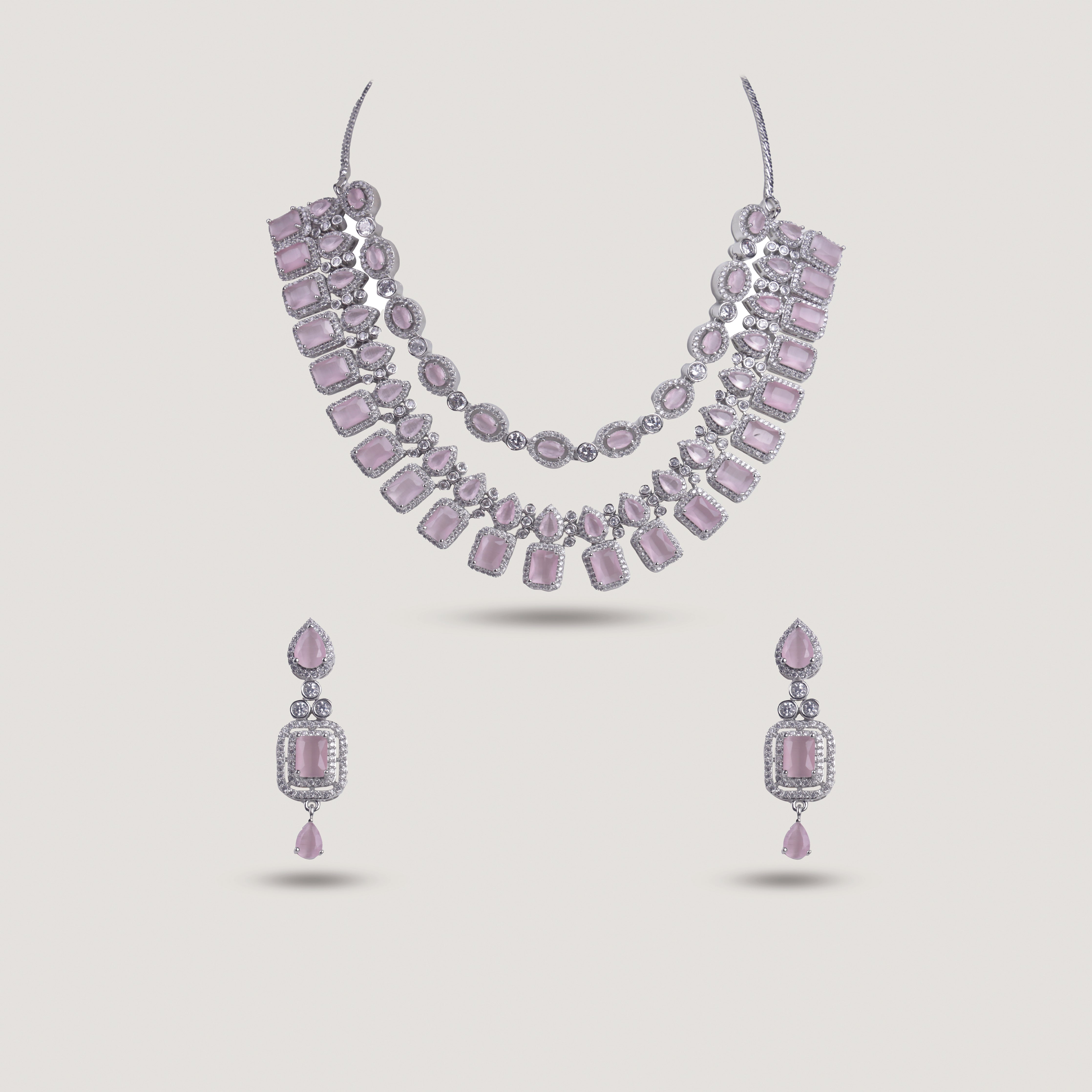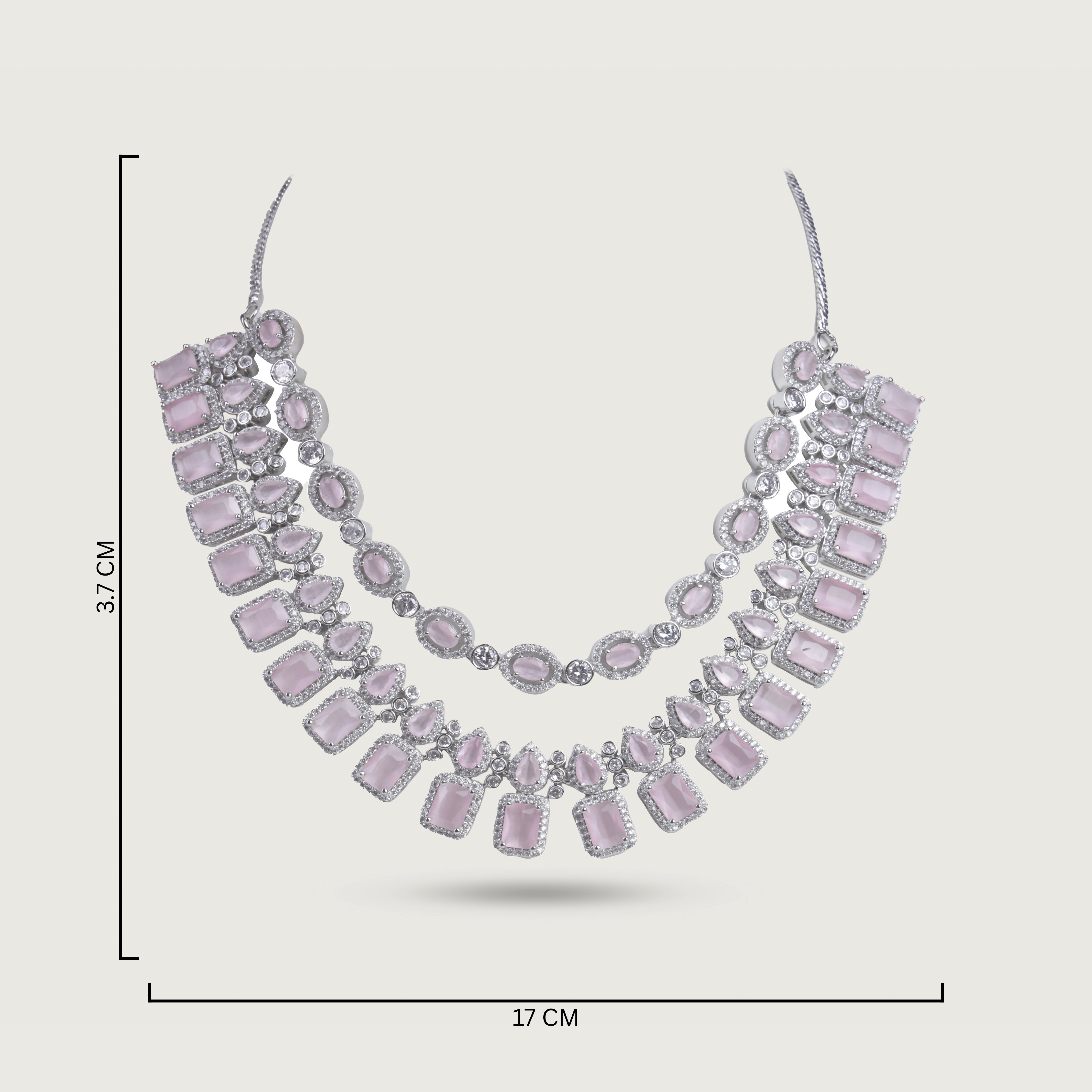The necklace sits delicately along the neckline, offering just the right amount of sparkle, while the coordinating earrings add a gentle drop that enhances movement and femininity. Perfect for weddings, festive occasions, and elegant evenings, Leeah blends modern design with classic charm.