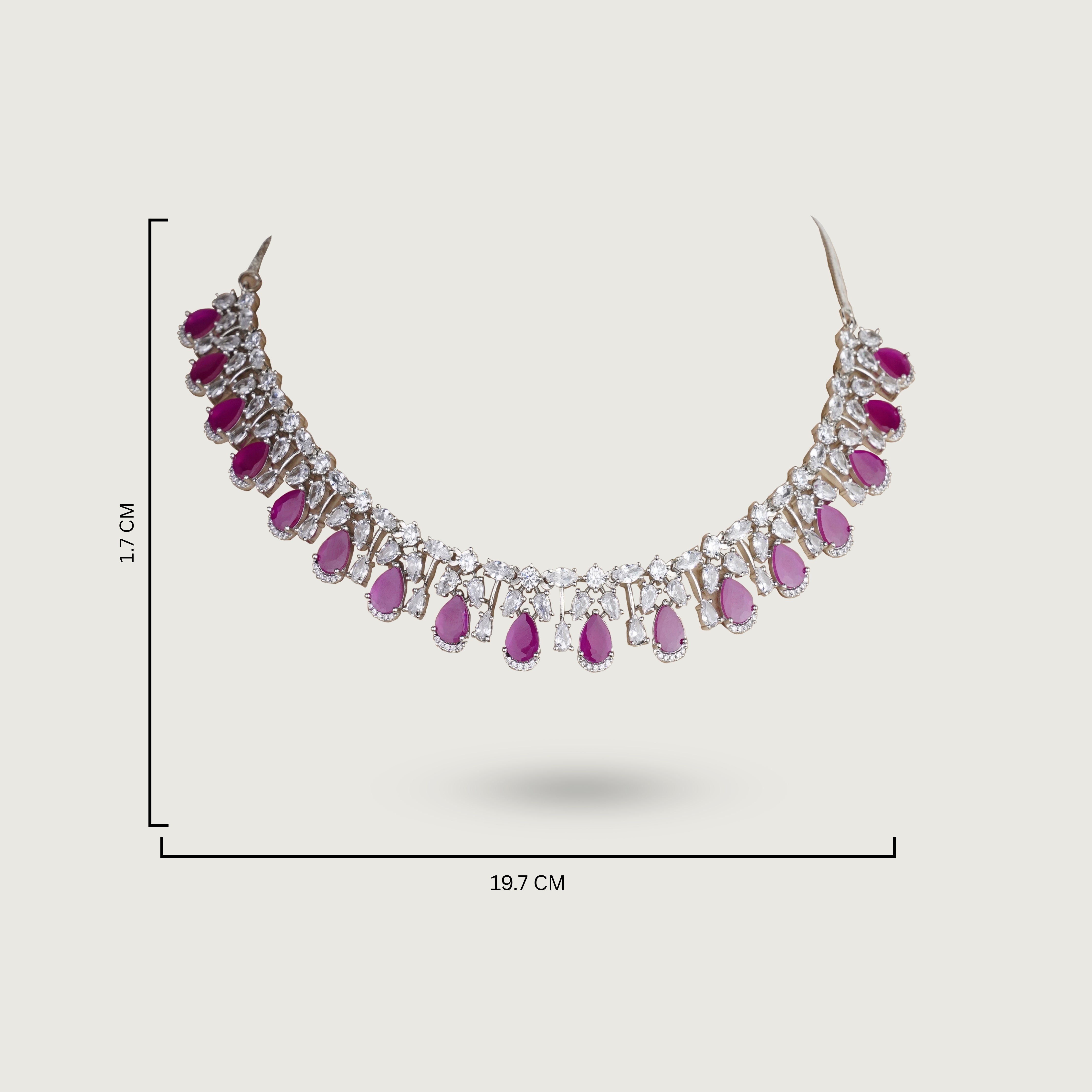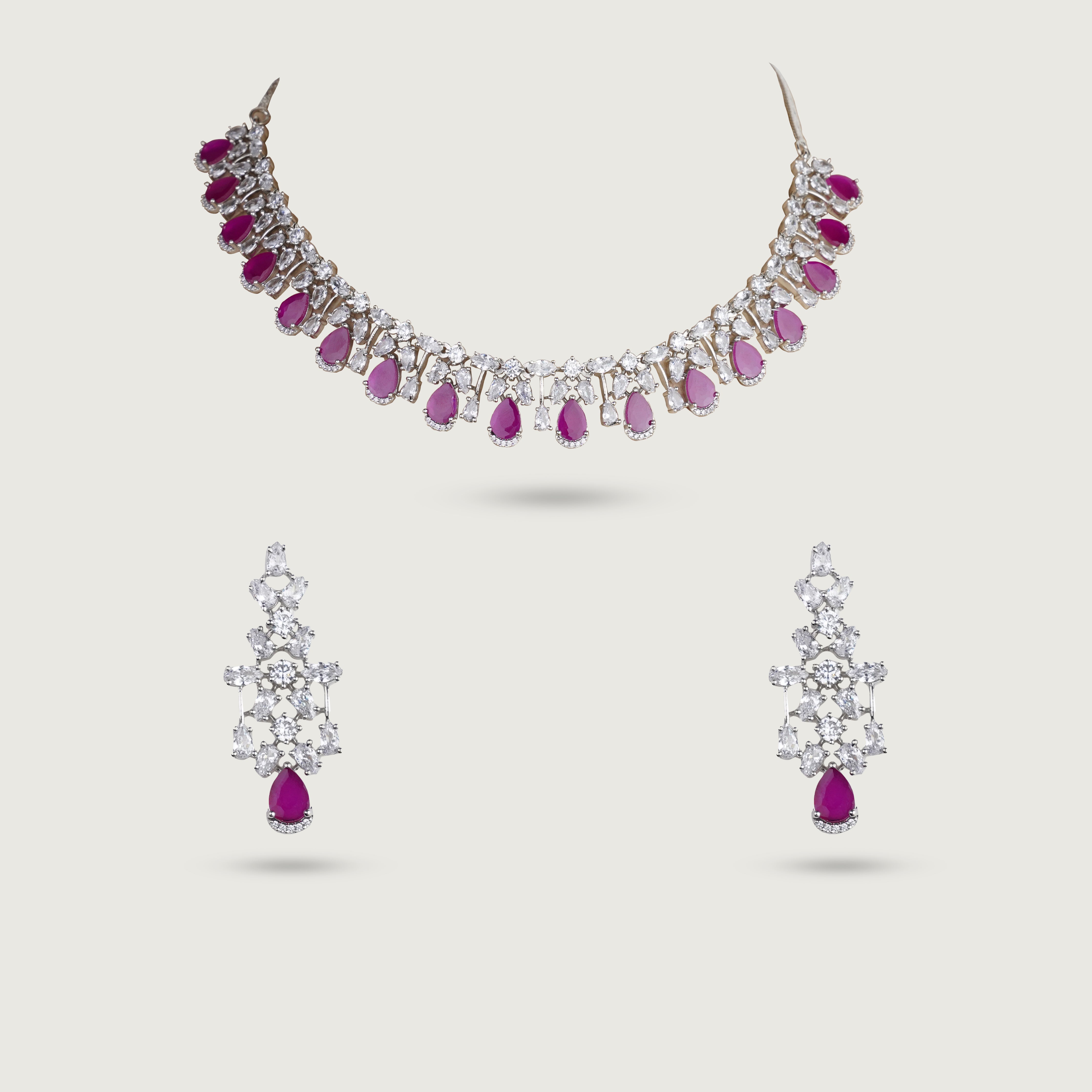 The necklace sits neatly along the neckline, creating a structured frame that feels timeless and formal. Coordinated drop earrings mirror the design with precision, adding subtle movement while maintaining harmony throughout the set. Ideal for formal events, receptions, and occasion wear, Emily is designed for those who appreciate elegance with clarity and restraint.