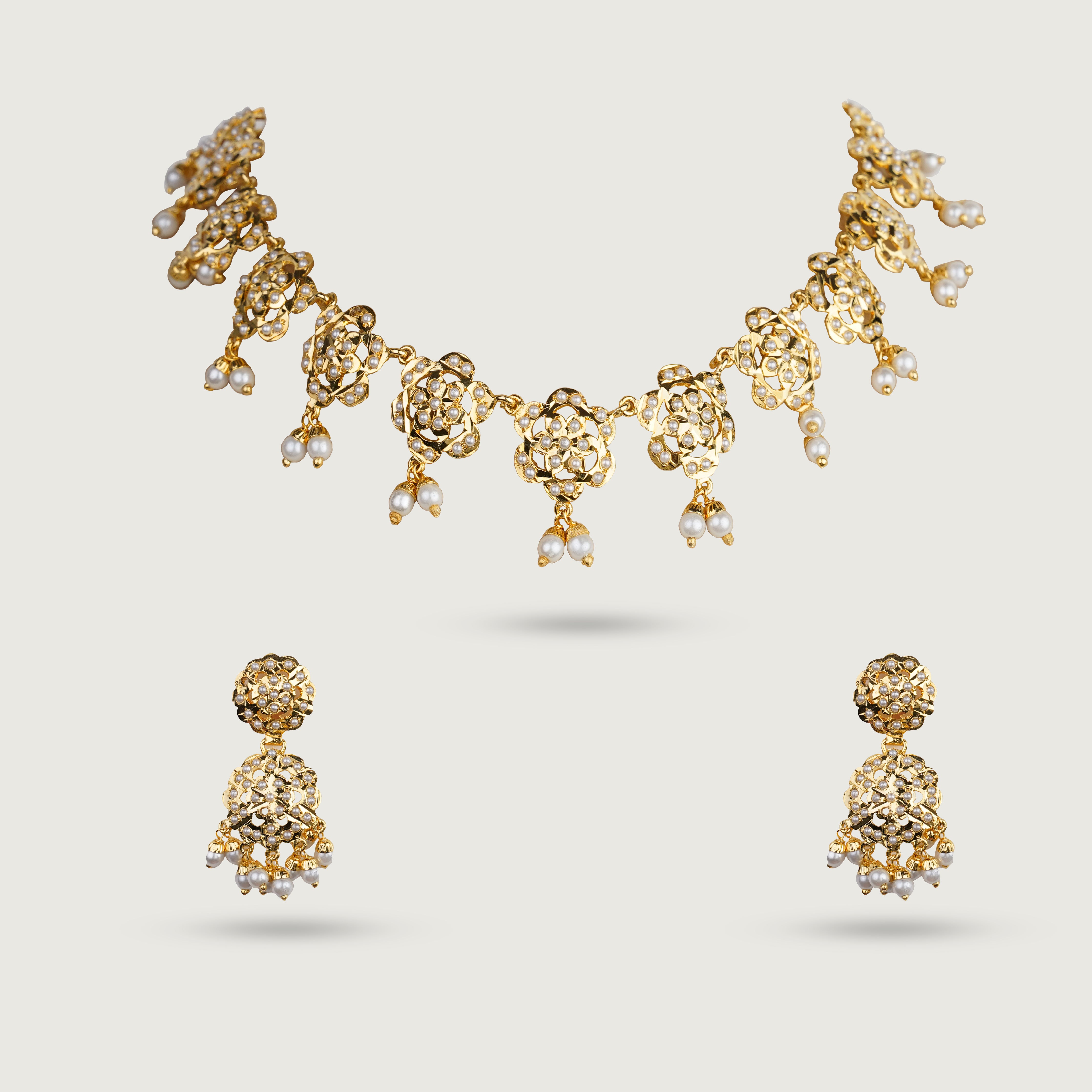 The necklace offers a clean, fluid silhouette that feels light yet polished, making it ideal for both daytime wear and evening occasions. Coordinated earrings add subtle balance and glow, completing the ensemble with quiet sophistication. Perfect for weddings, formal gatherings, and day-to-night styling, Navneet is a versatile essential that elevates without excess.