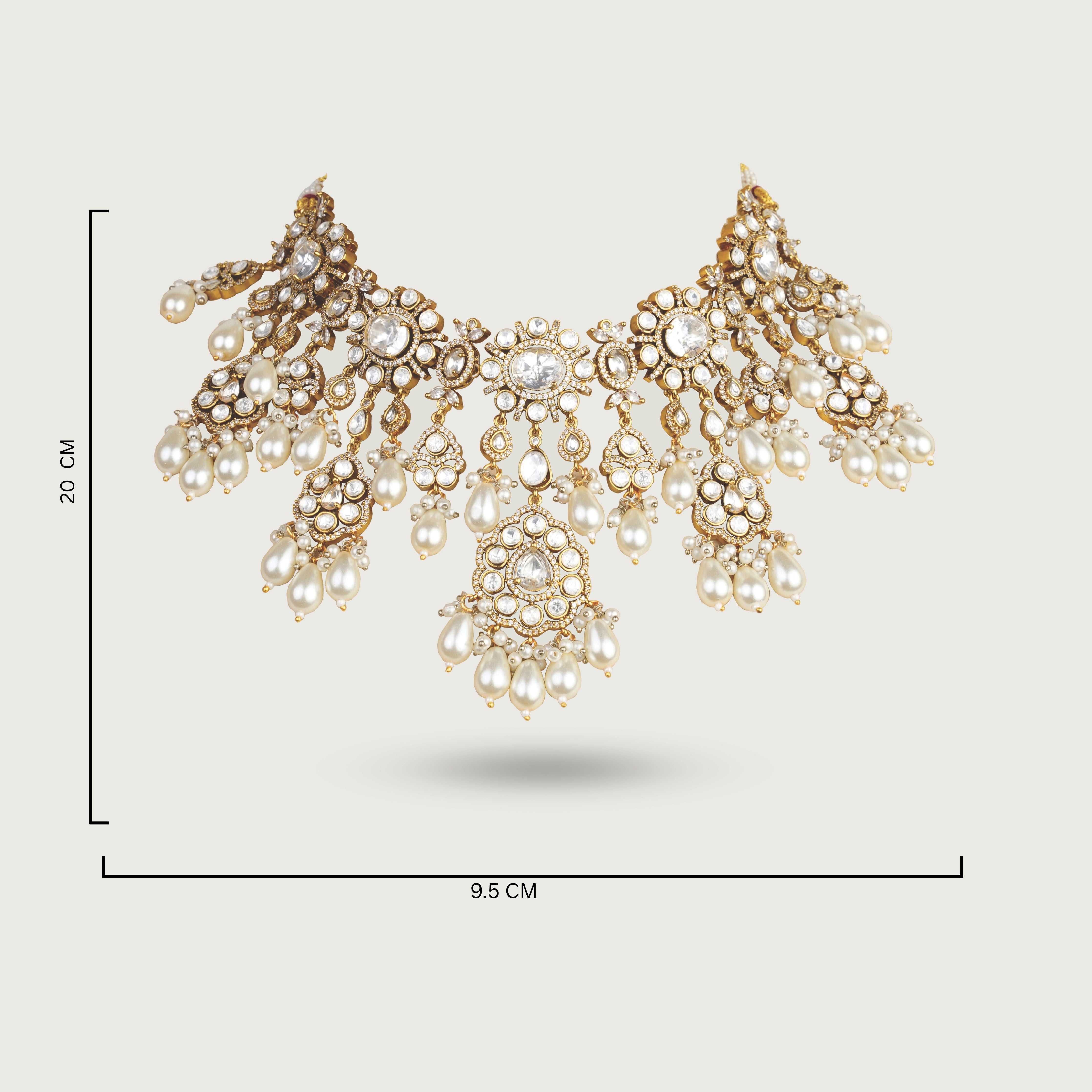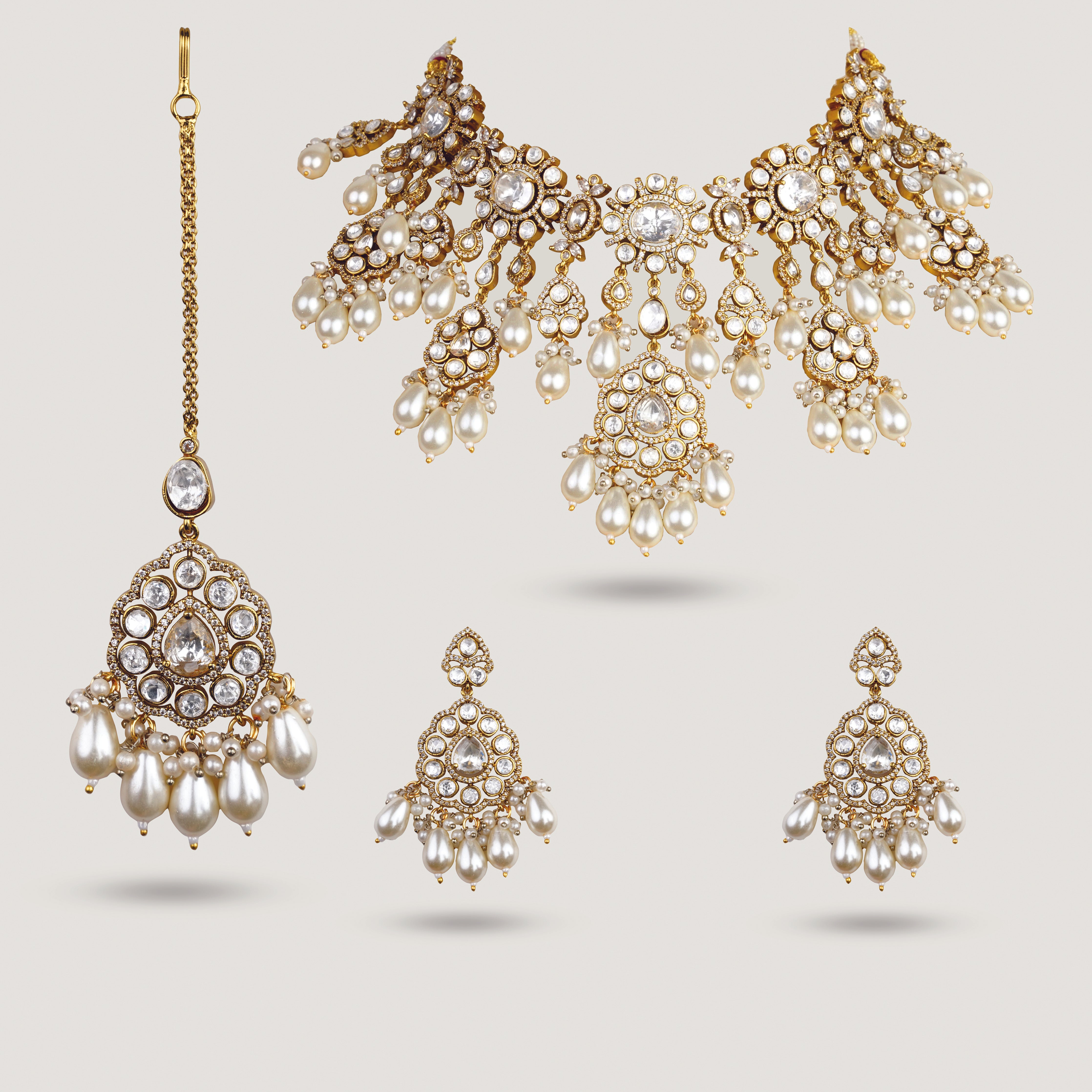 The necklace sits cleanly along the neckline, offering a smooth, understated silhouette that feels timeless and versatile. Coordinated earrings echo the simplicity with soft shine, while the maang tikka completes the ensemble with balance and quiet sophistication. Ideal for weddings, formal occasions, and elegant day-to-evening wear, Tarz proves that simplicity can be striking.