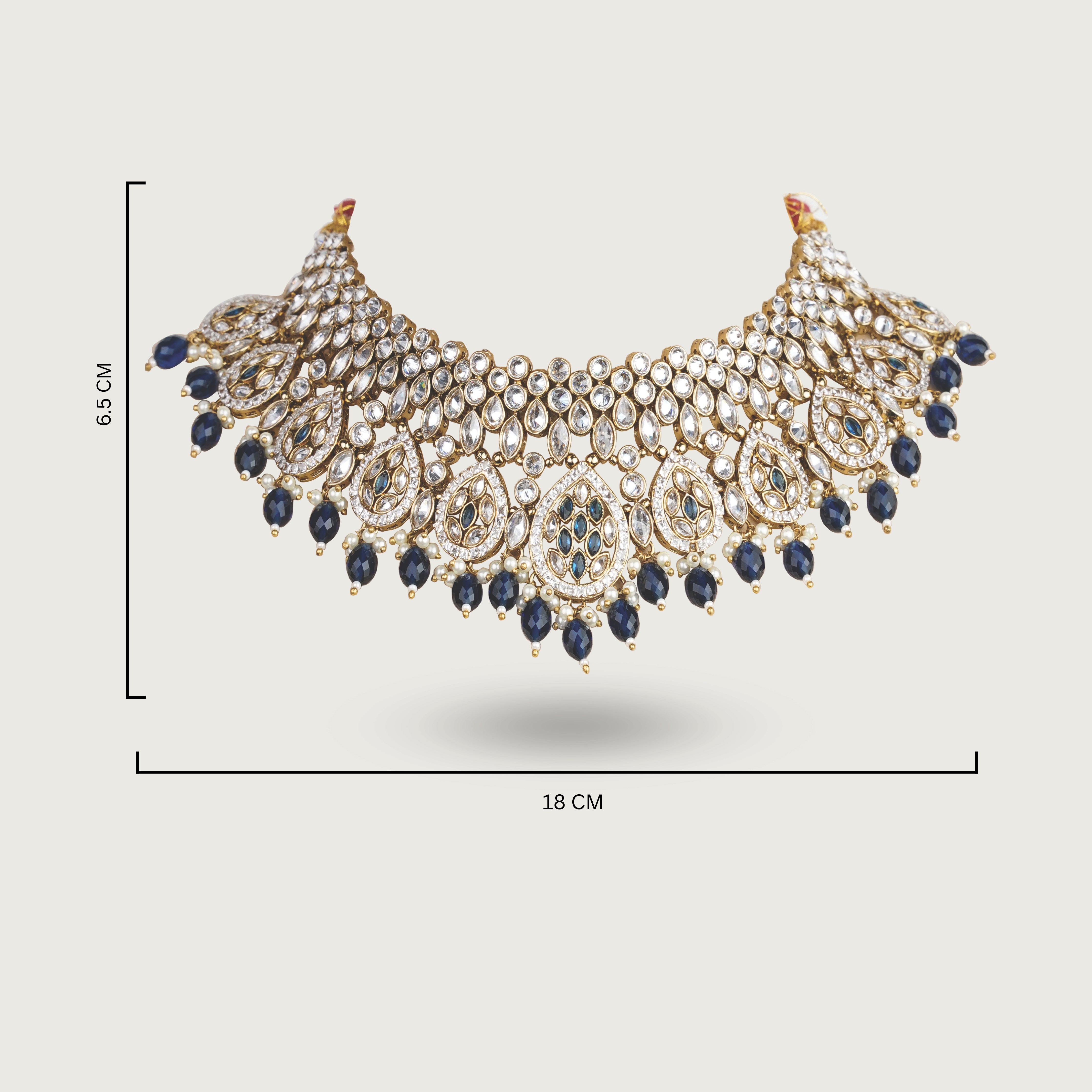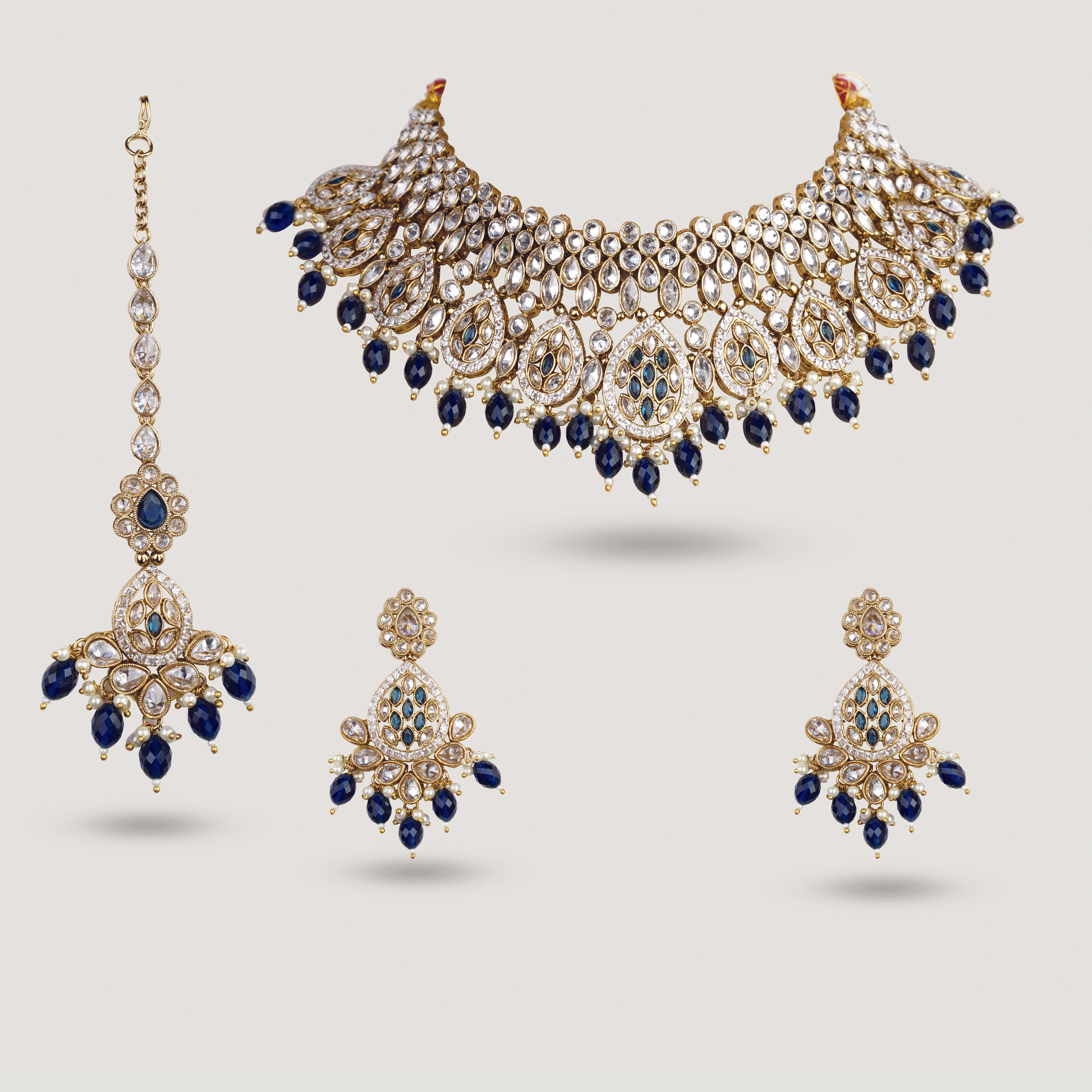The necklace sits with quiet confidence along the neckline, offering strength without heaviness. Coordinated earrings add a refined statement, while the maang tikka completes the look with poised symmetry. Ideal for weddings, festive occasions, and elegant evenings, Amber exudes an unmistakable aura of power, grace, and timeless appeal.