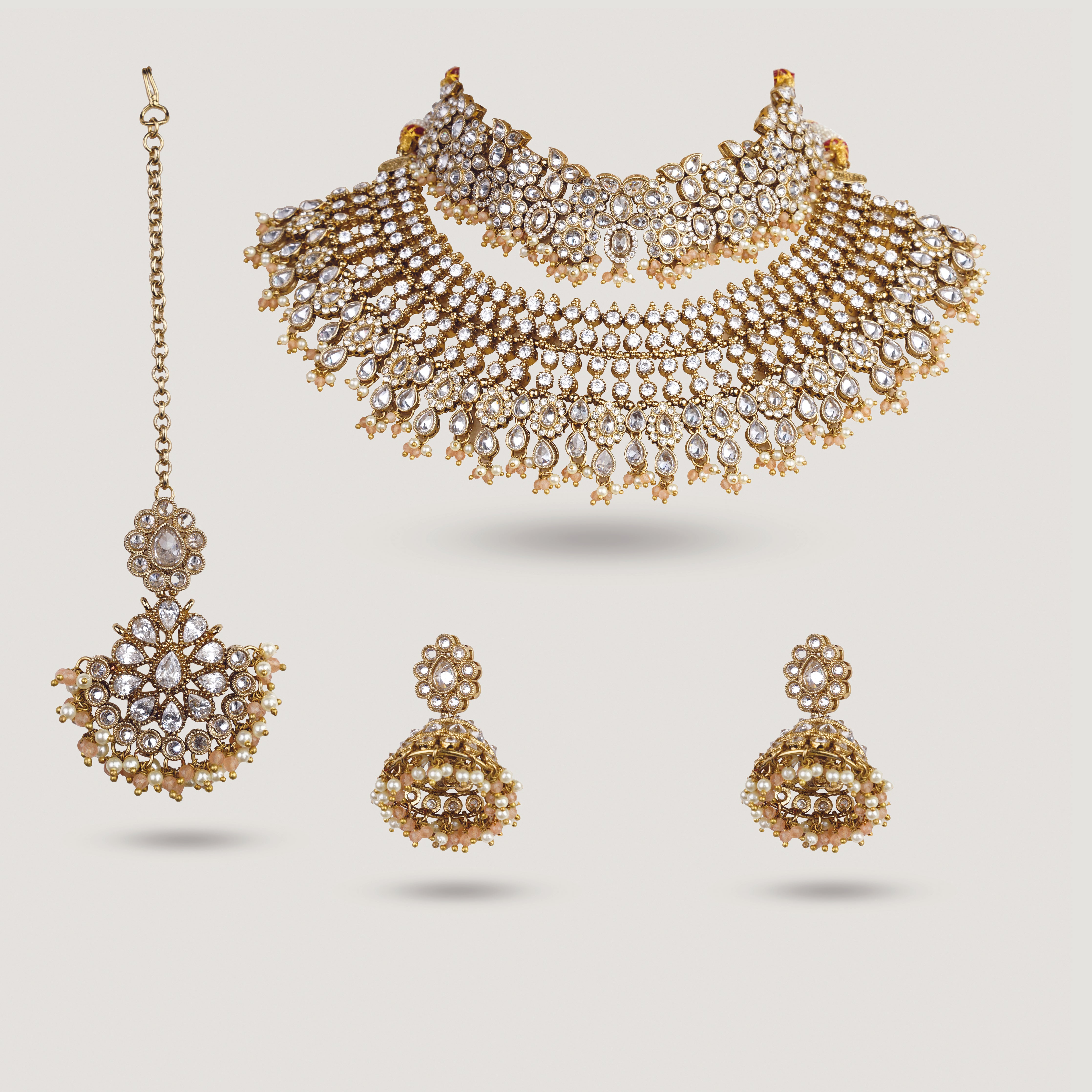 The structured choker sits boldly at the neckline, creating a striking focal point, while the complementary necklace adds depth and richness. Coordinated earrings bring refined movement, and the maang tikka completes the ensemble with symmetry and strength. Perfect for receptions, grand celebrations, and statement moments, Ekam is designed for those who own every room they enter.