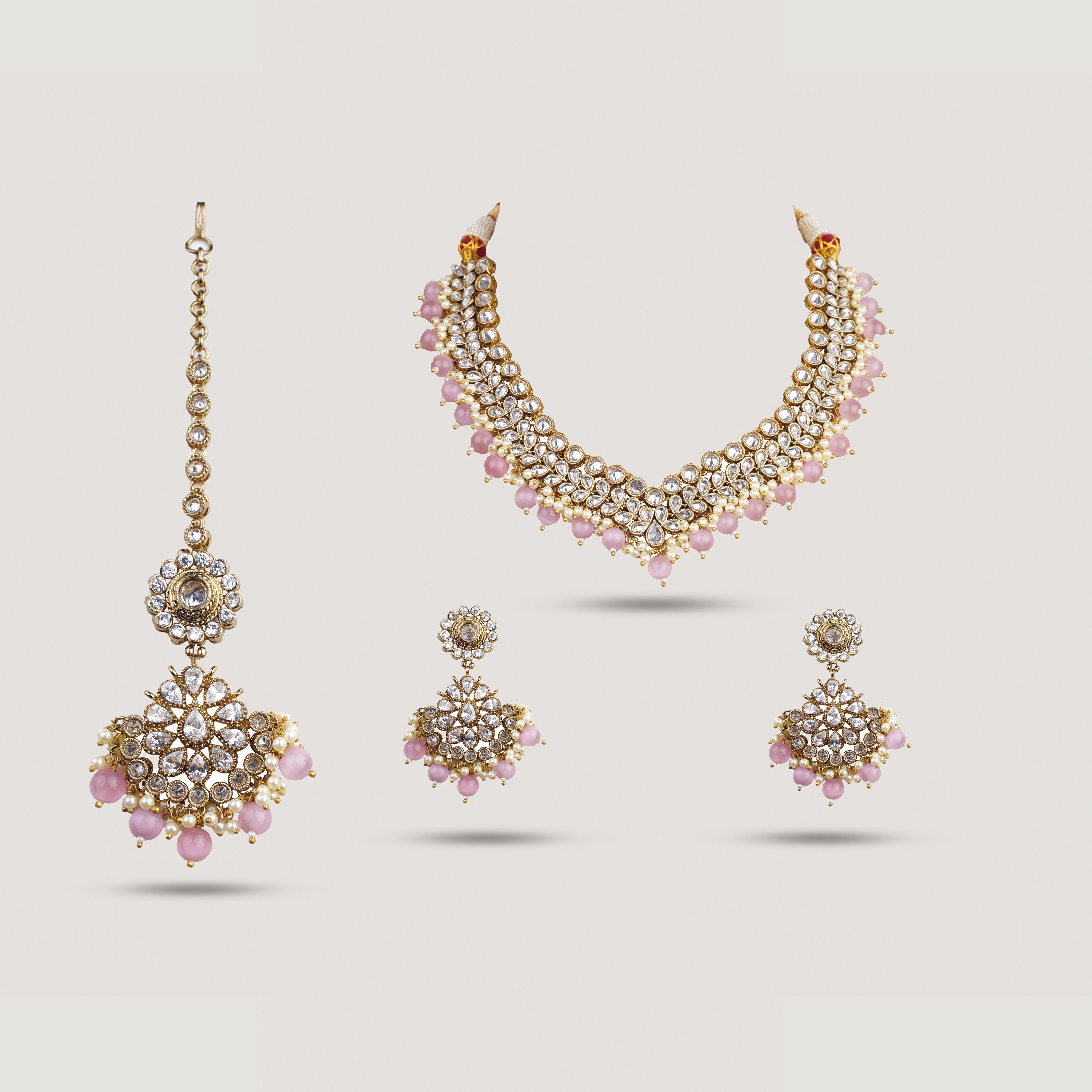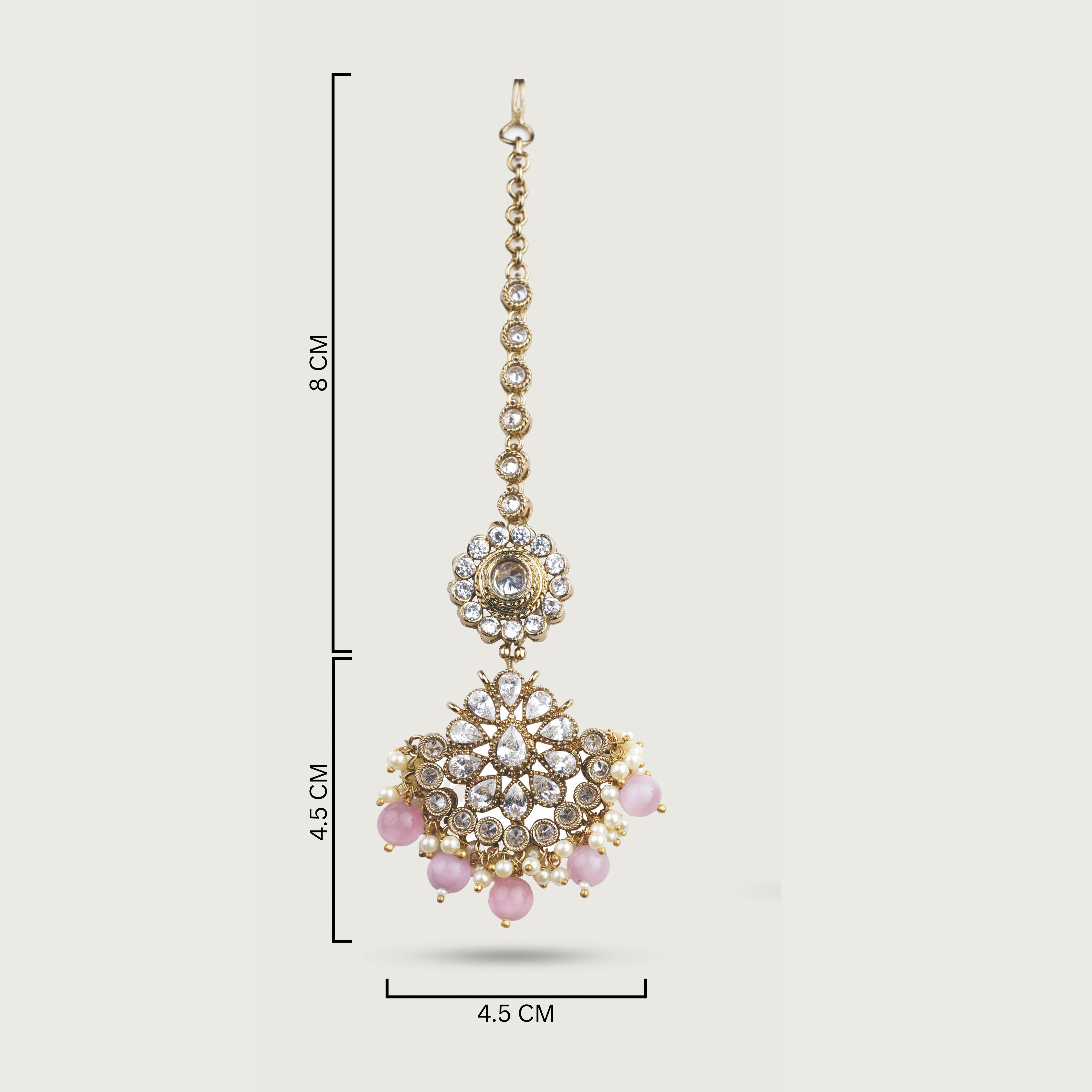 The necklace sits beautifully along the collar line, offering subtle brilliance, while the elongated earrings and coordinated maang tikka add presence and symmetry. Perfect for weddings, festive occasions, and formal gatherings, Mani delivers timeless elegance with effortless wearability.