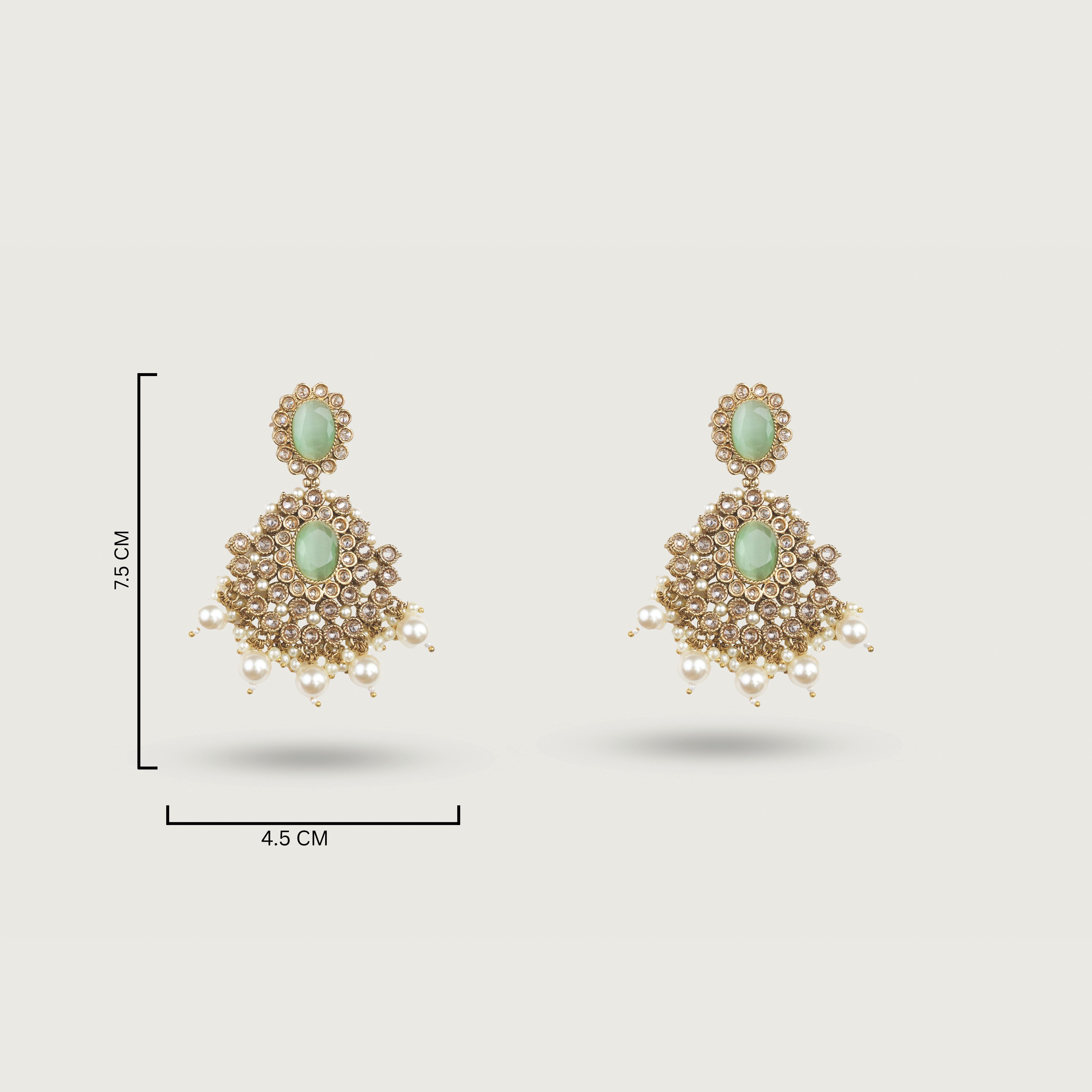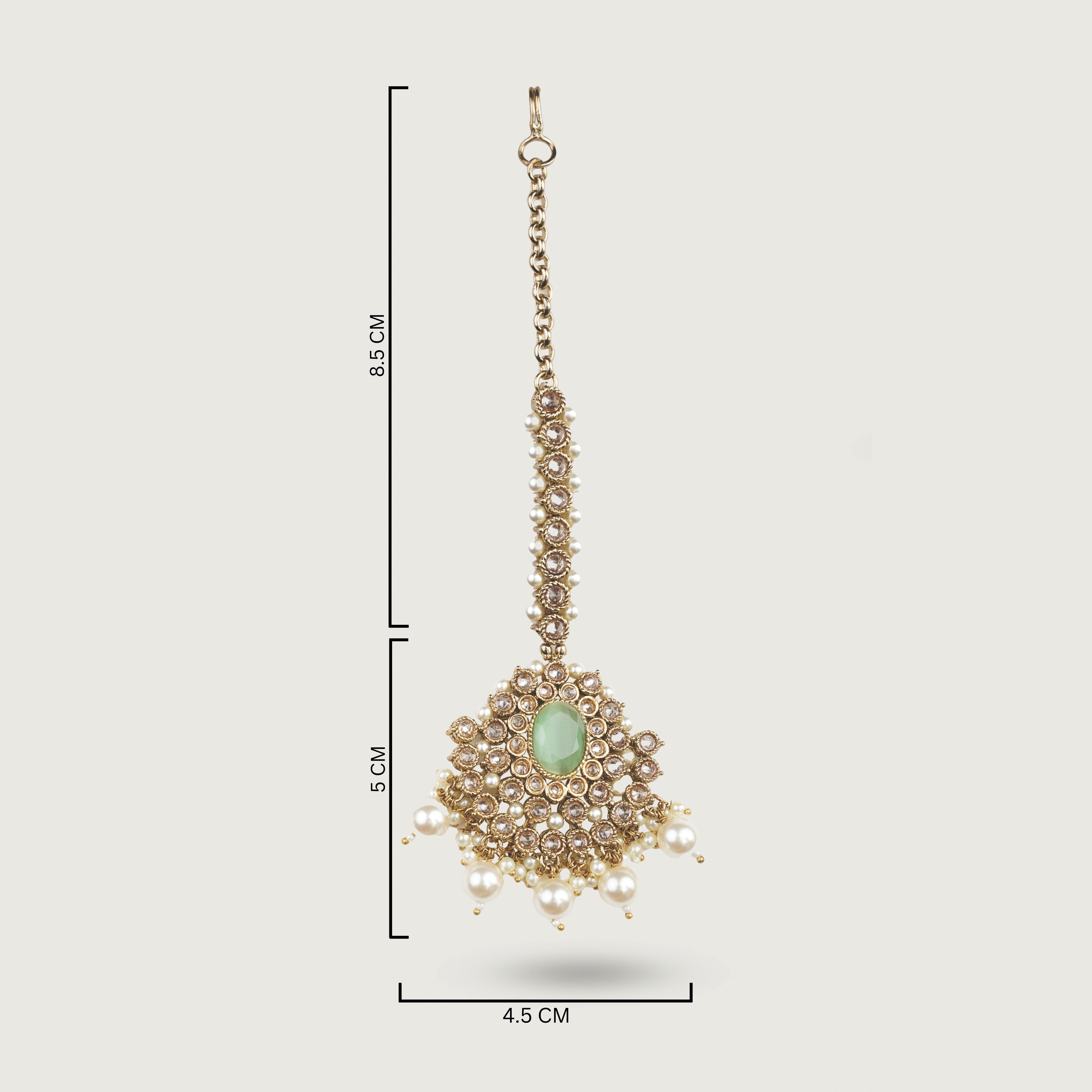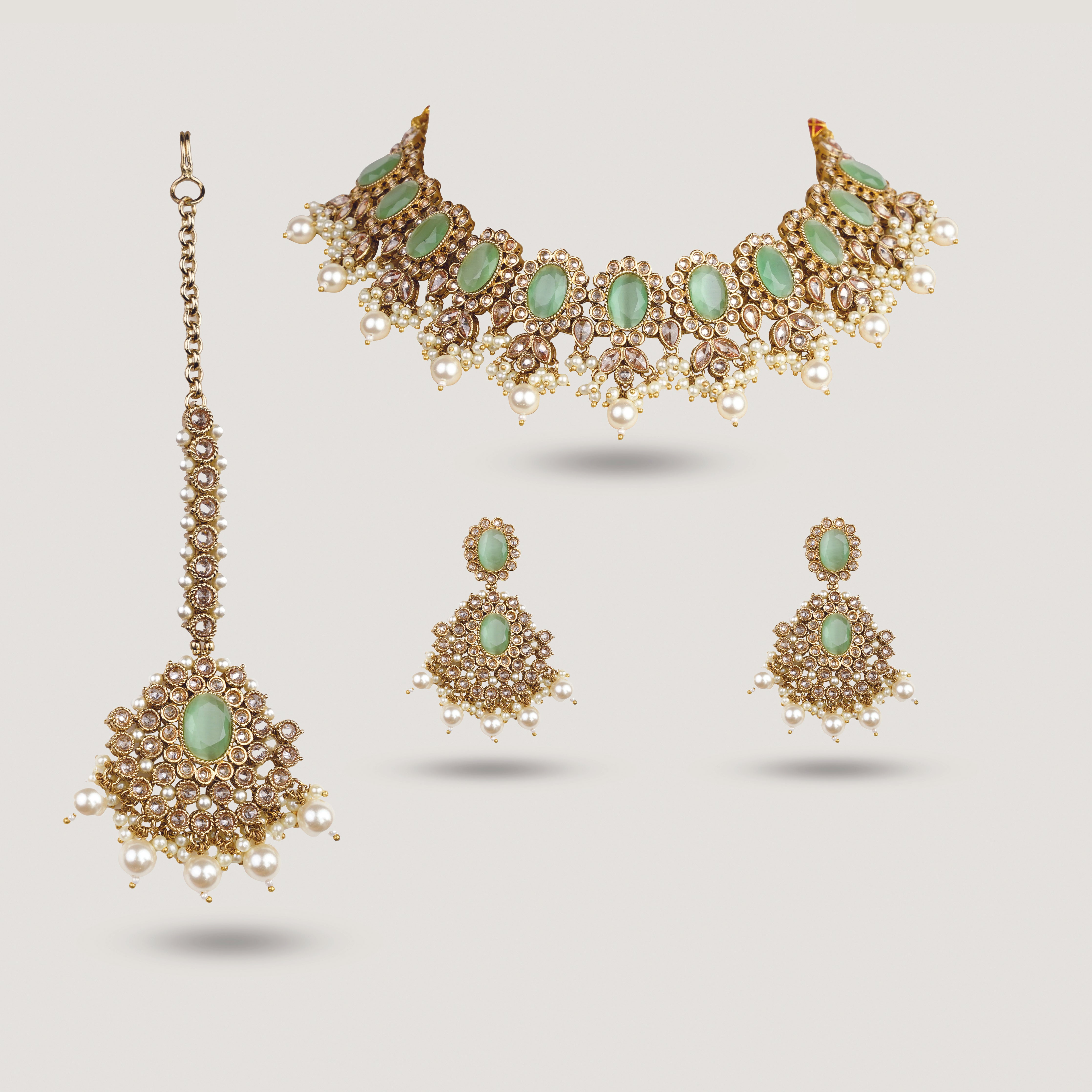 The necklace sits neatly along the collar line, complemented by elongated earrings and a beautifully proportioned maang tikka that add presence and symmetry. Ideal for weddings, festive occasions, and formal celebrations, Prabh blends timeless elegance with modern wearability.