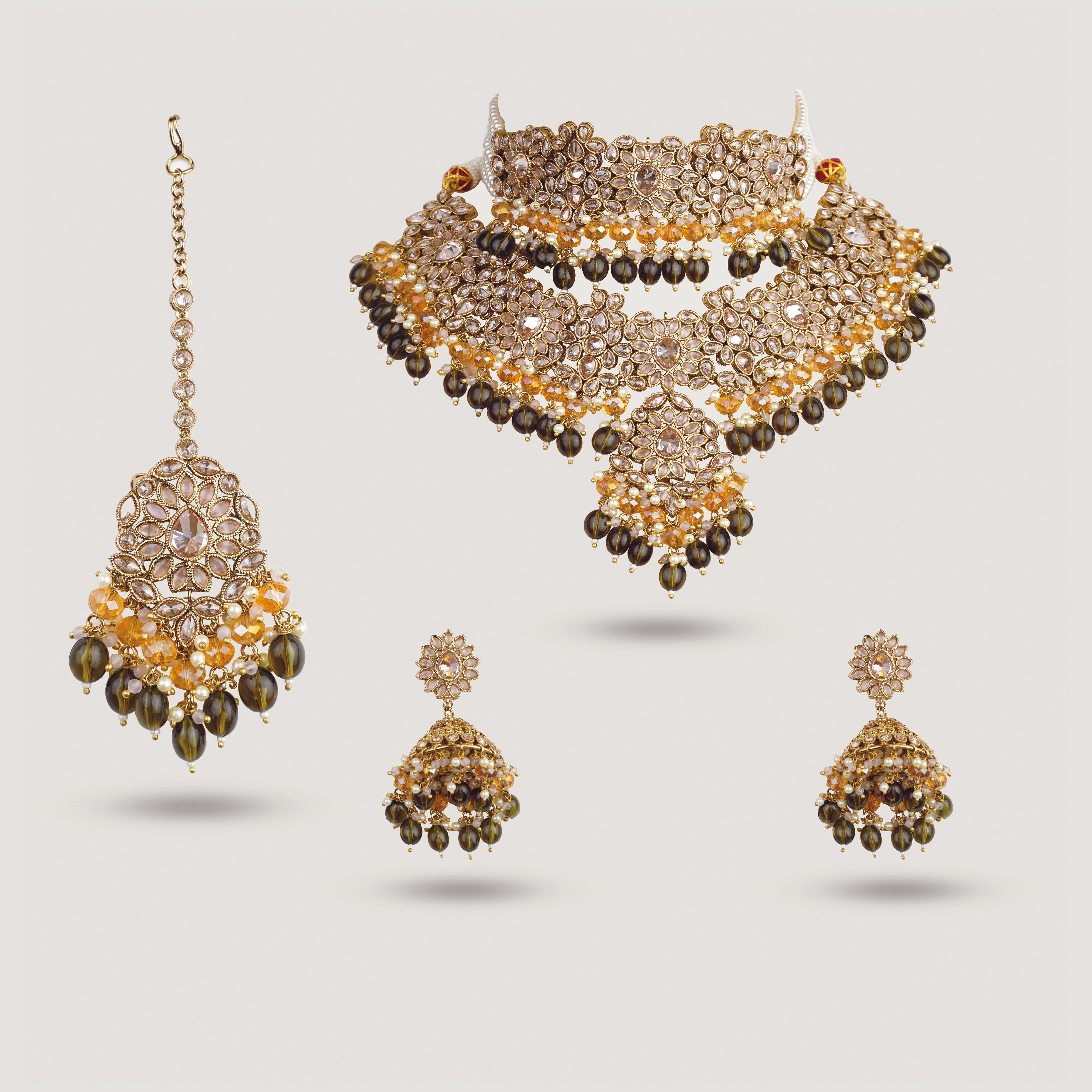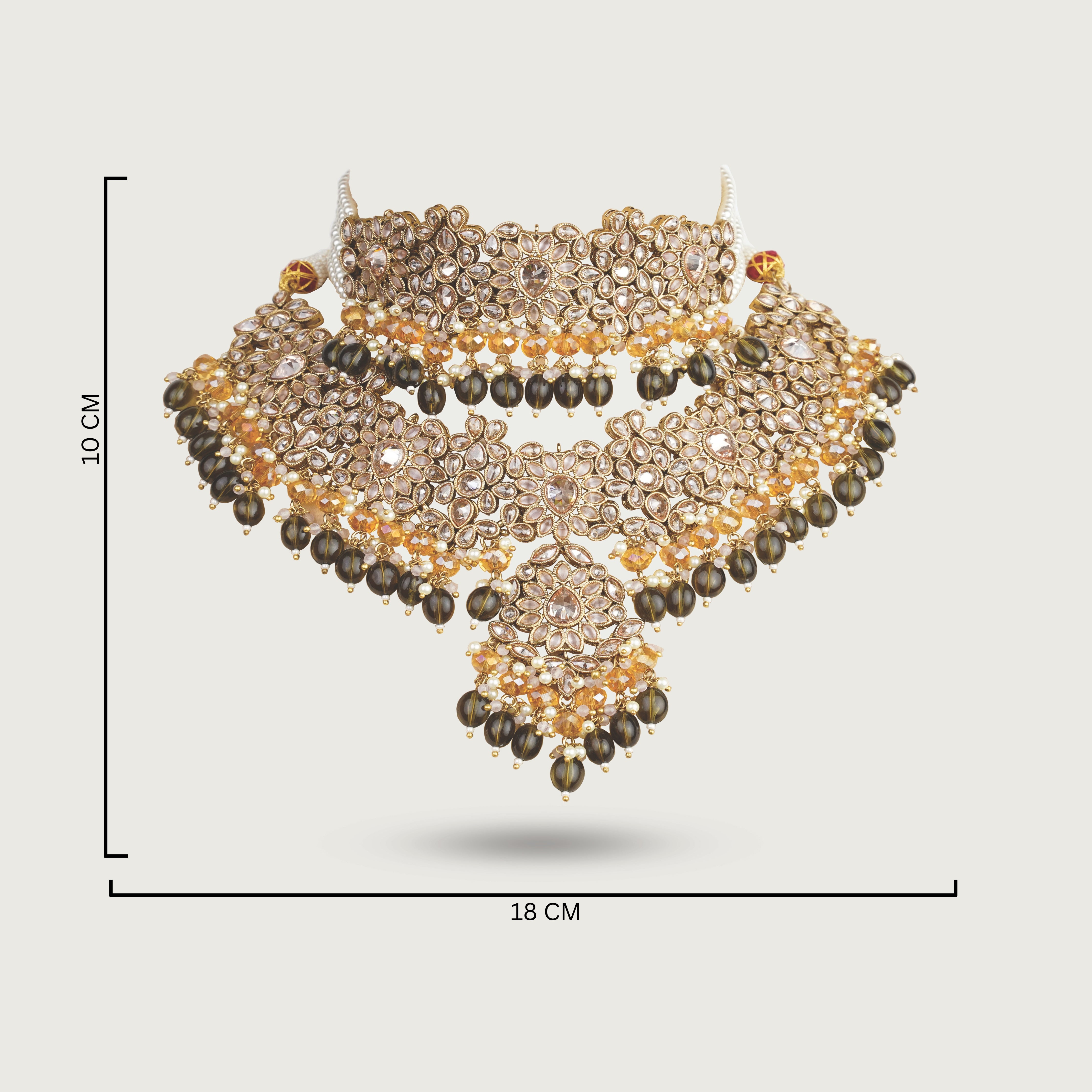 Adds depth and grandeur beneath the choker for a layered, luxurious finish.