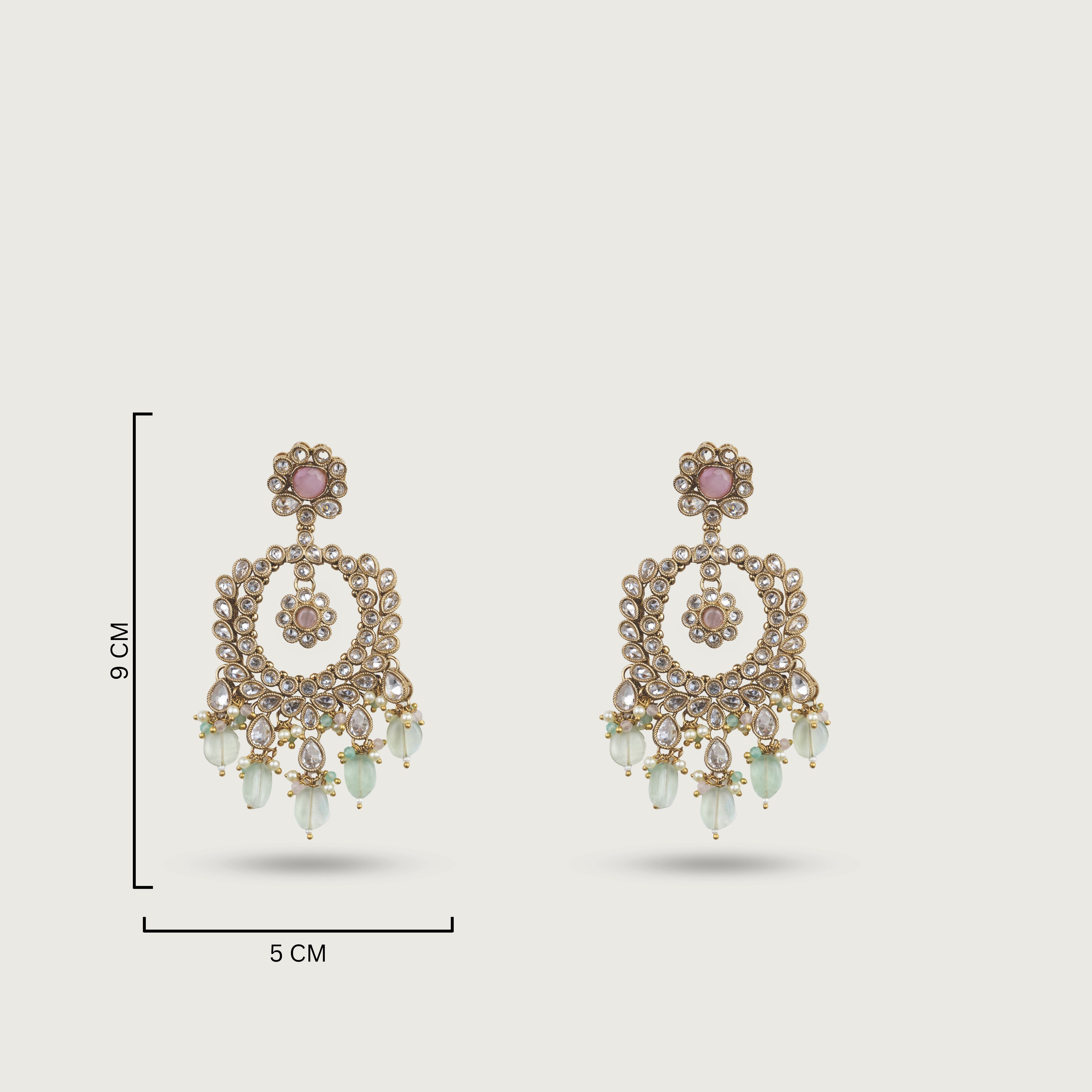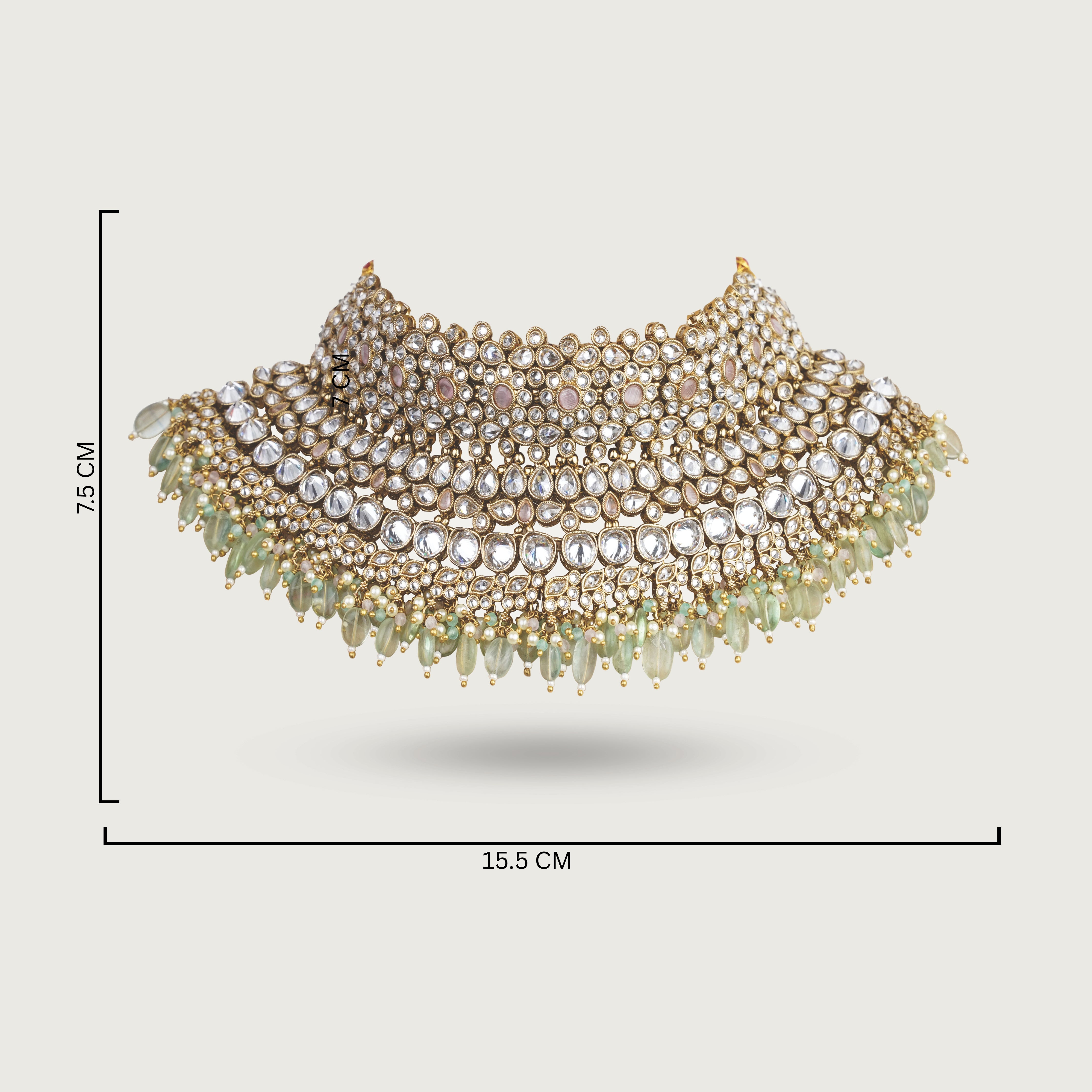 The necklace rests beautifully along the neckline, offering a refined statement that feels poised and luminous. Coordinated earrings add elongated elegance and movement, while the maang tikka completes the look with balance and composure. Ideal for weddings, receptions, and elevated celebrations, Simira transforms any moment into one of quiet grandeur.