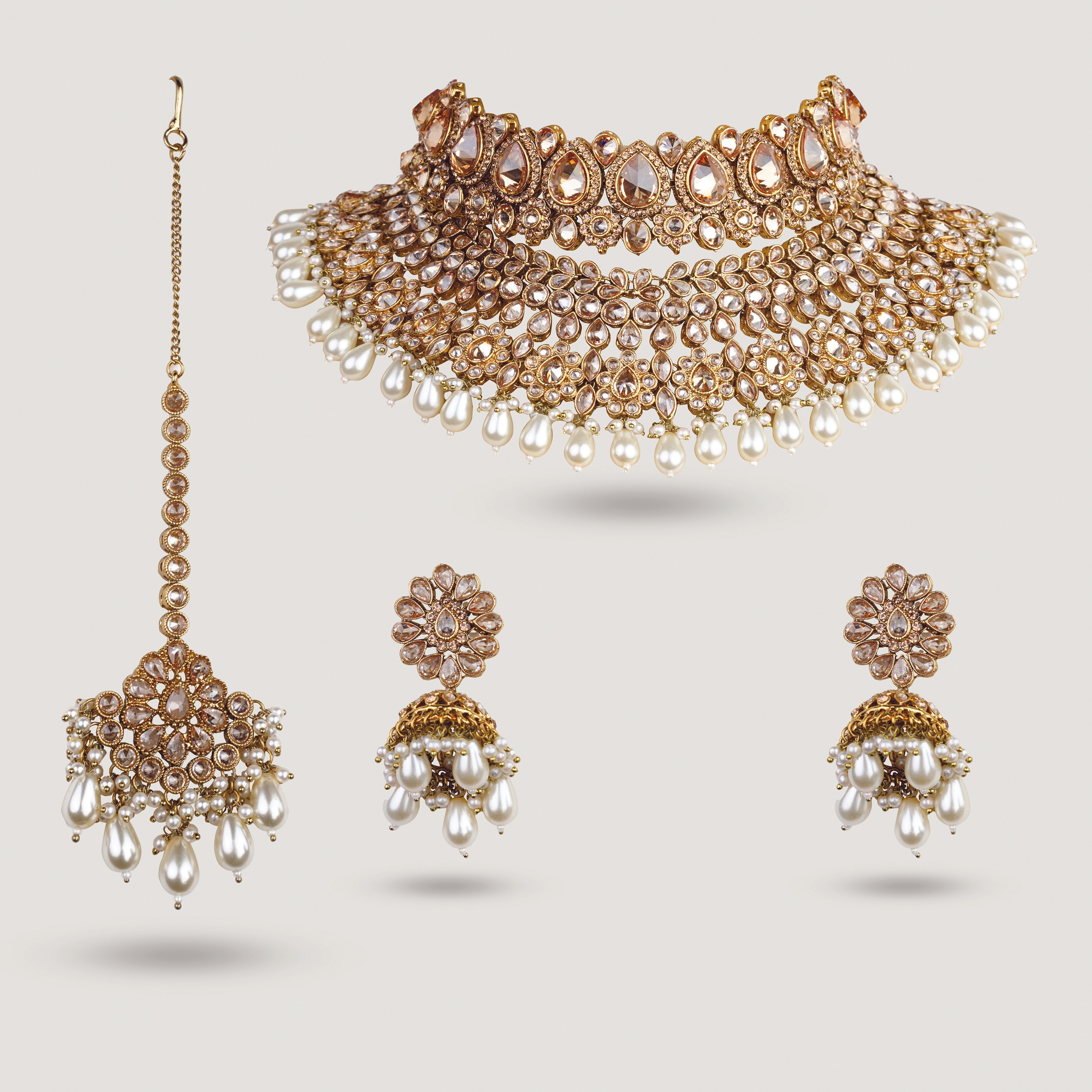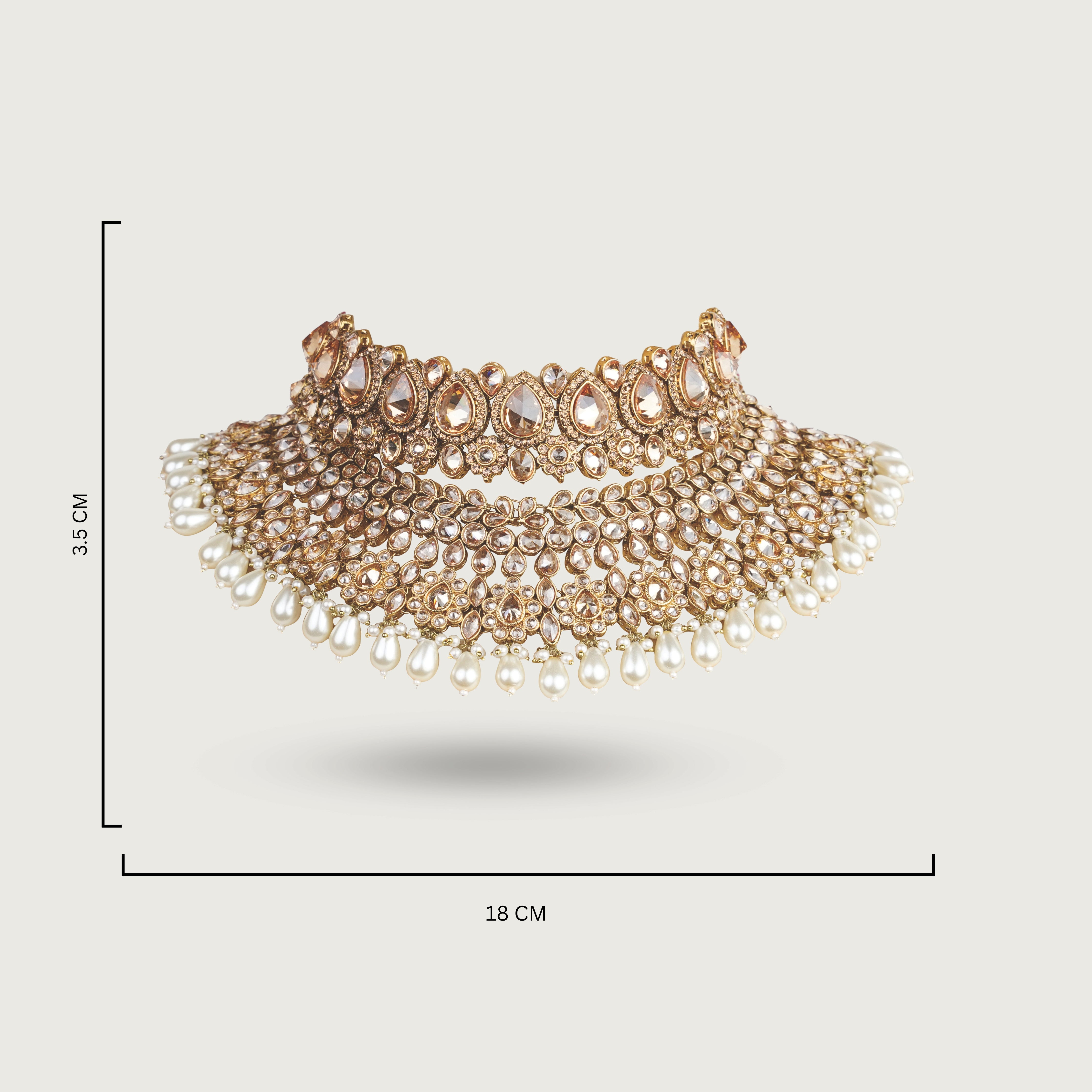 The layered choker sits close to the neckline, creating depth and impact without overwhelming the look. A complementary necklace adds richness and dimension, while coordinated earrings bring harmony and movement. The maang tikka completes the ensemble with symmetry and polish, making Chanchal ideal for receptions, grand celebrations, and high-impact occasions.