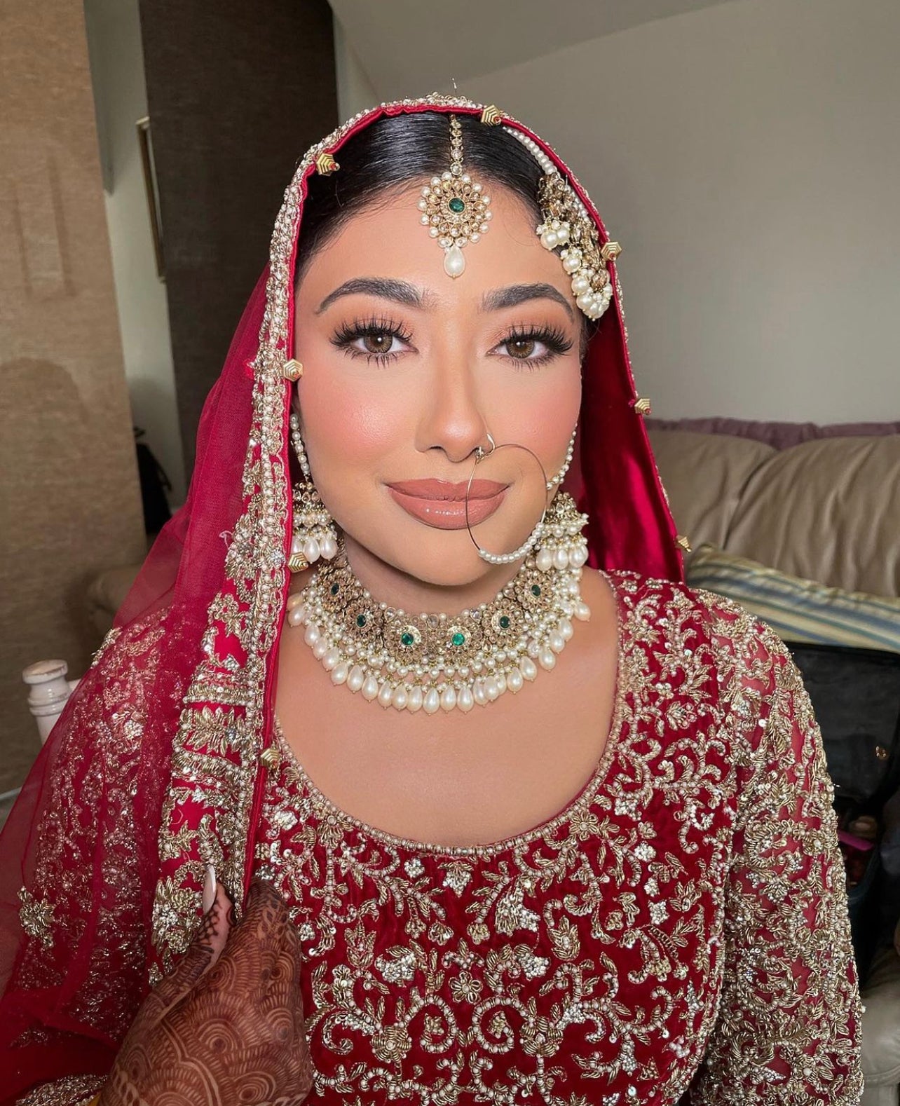 Malinder opted to go for a classic emerald green contrast with the off white pearls against her red lehnga!
