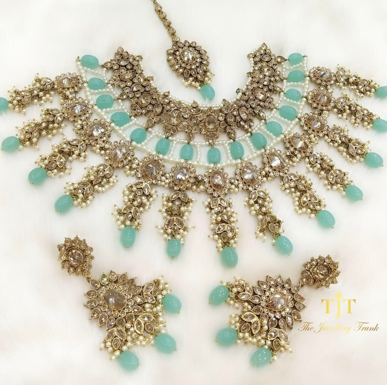 A one piece choker necklace set, which is begins as a high neck choker and comes down to a necklace. This is perfect if you are opting to go for a statement neck piece for your outfit. The mint pearls in between the stones provide a nice contrasting element to break up the gold work.
