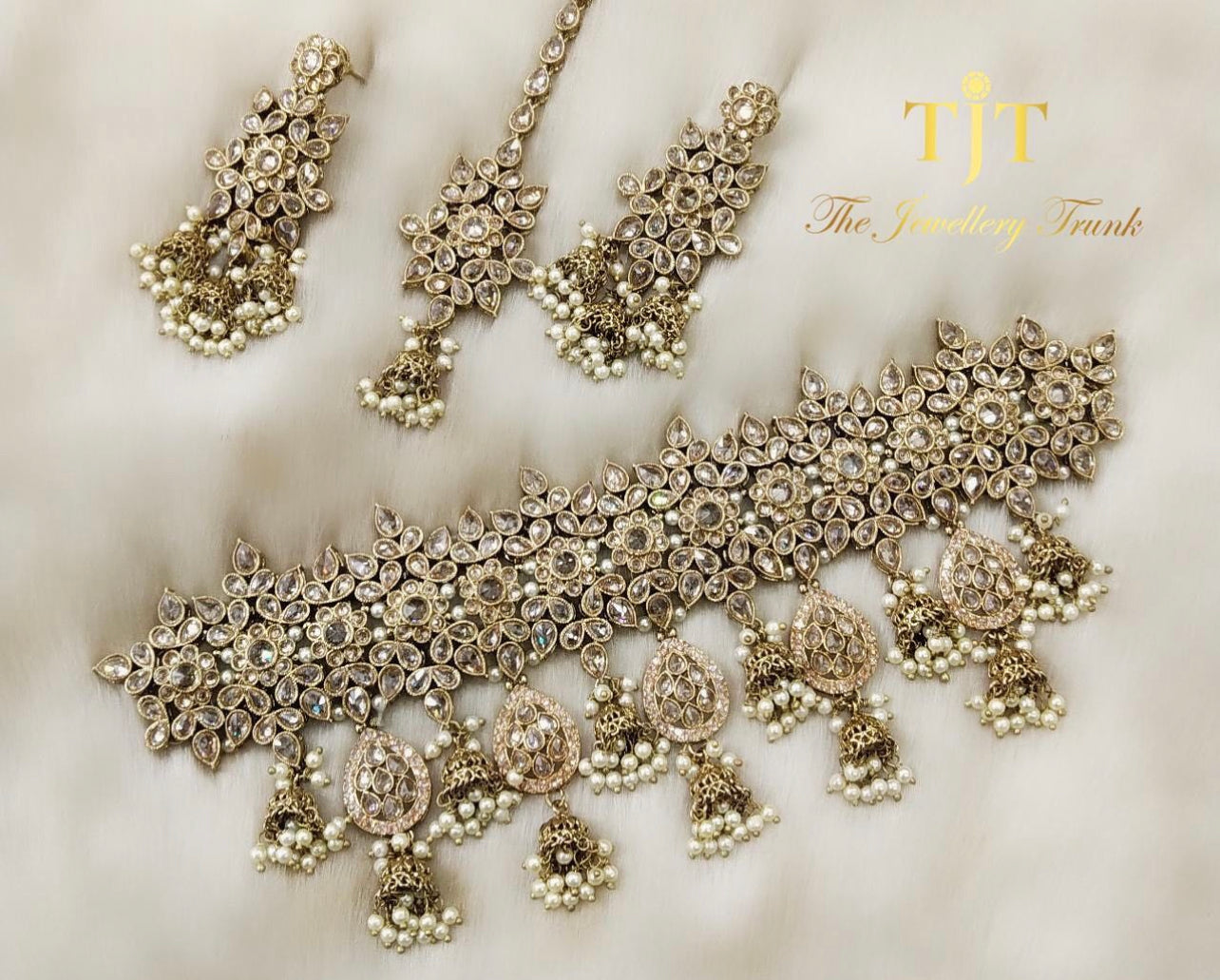 A high neck choker, which begins on the neck with droplets that falls down onto the neck giving it the more fuller look. The addition of the little Jhumka on the drops give a subtle contrast and breaks up the stonework.