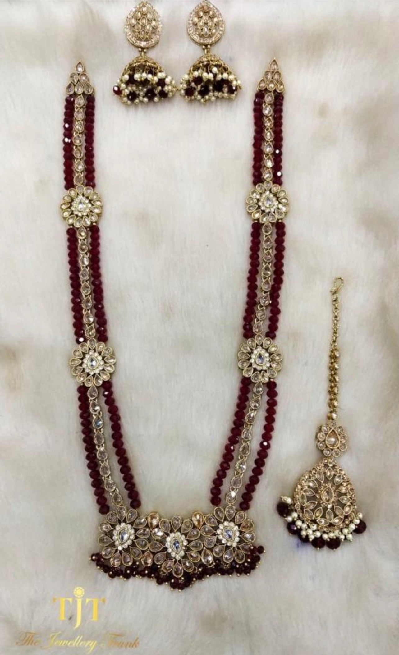 Maroon crystals with off white lariyaFor custom and urgent orders please contact us via email on info@thejewellerytrunk.com, alternatively whatsapp us on +447896705464