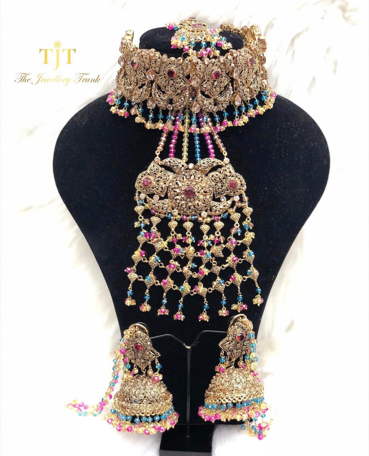 A high neck Pakistani finework choker set which sits higher up on the neck.