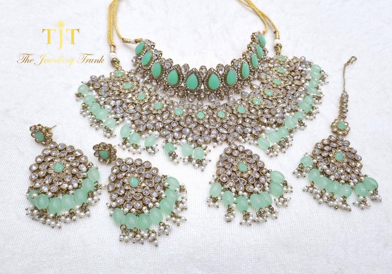 A stonework necklace set with a pendant which sits lower on the neck area. This is ideal of your outfit has a v neck or sweetheart neckline.