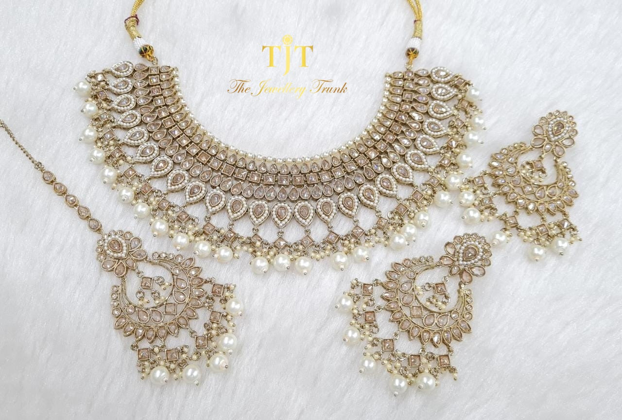 A necklace set that sits on the collarbone