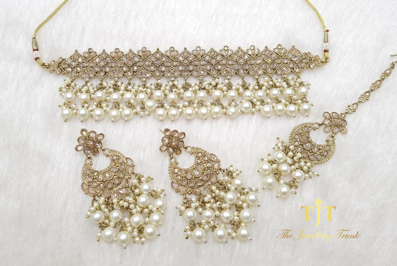 A high neck choker set which sits higher on the neck with the addition of droplets that fall onto the collarbone.